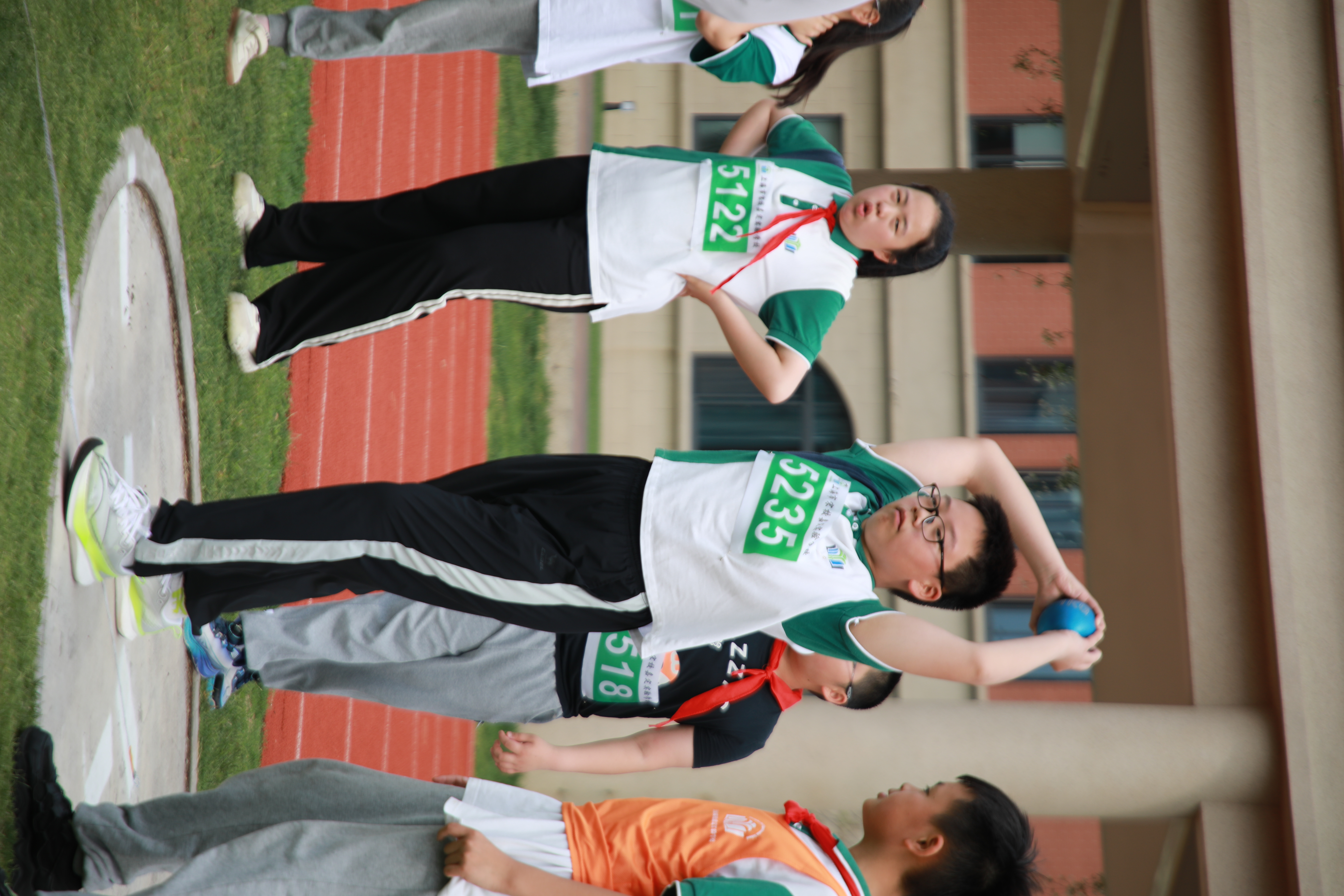 实心球比赛现场,四、五年级的运动员们个个卯足了劲。他们双手紧握实心球,身体后仰,利用腿部、腰部和手臂的力量将球奋力推出。实心球在空中划过一道抛物线,重重地落在远处的地面上。每一次投掷,都展示了运动员们强大的力量和出色的技巧。