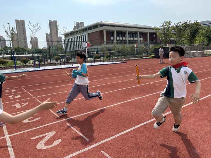 50 米迎面接力跑是最具团队协作精神的项目之一。运动员们分成两组,站在赛道两端,严阵以待。当第一棒选手手持接力棒冲出去时,整个赛场的气氛瞬间被点燃。孩子们全力奔跑,将接力棒精准地传递给下一位队友,每一次交接都关乎着团队的荣誉。在接力过程中,大家配合默契,眼神交汇间充满了信任与鼓励。呐喊声回荡在整个赛场,孩子们齐心协力,向着胜利的方向奋勇前进。