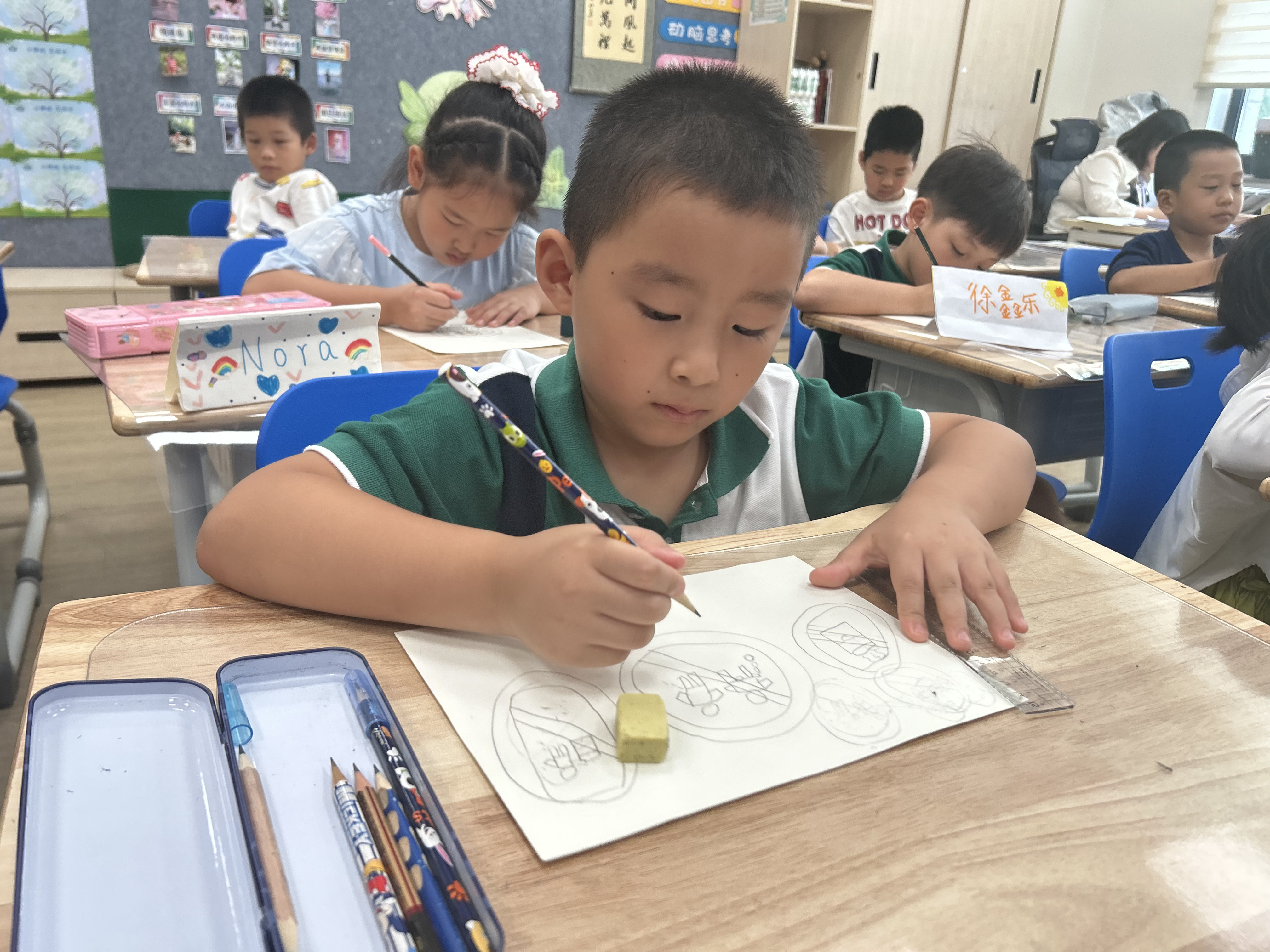 低年级的美术课堂,是一场关于“规则”的趣味启蒙。老师们化身“引路人”,带着孩子们认识这些“无声的向导”——从禁止标识的醒目红、警示标识的警示黄,到指示标识的清晰蓝。孩子们不仅读懂了标识背后的安全密码,更用画笔赋予了它们温度与情感。课堂上,严肃的警示标识有了可爱的笑脸,指示符号融入了天马行空的想象。枯燥的规则,在孩子们手中变成了萌趣的艺术符号,让安全意识与审美情趣同步生长。