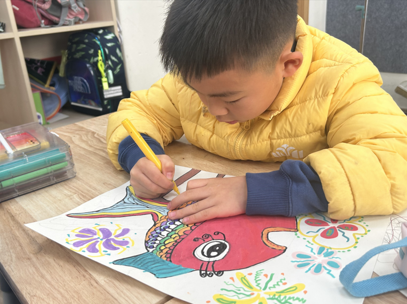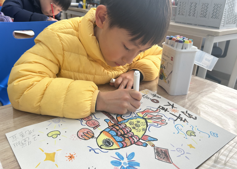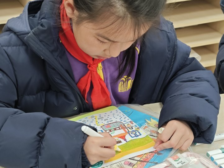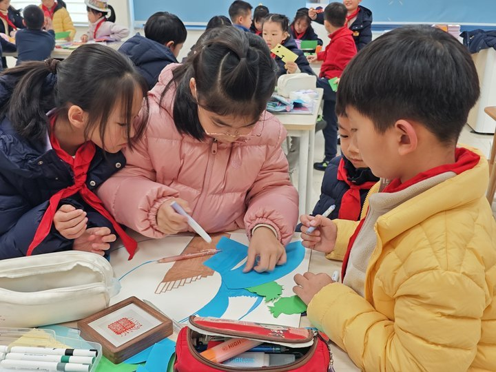 美术课上,孩子们共绘华东:从安徽鱼灯的暖光、台湾小吃的甜香,到金山农民画的浓彩;从景德镇瓷韵的青白、苏州园林的漏窗光影,到山东风筝的高扬;从浙江茶山的青雾,画至闽台巷口的炊烟。笔尖划过,华东地区的特色便跃然纸上。
