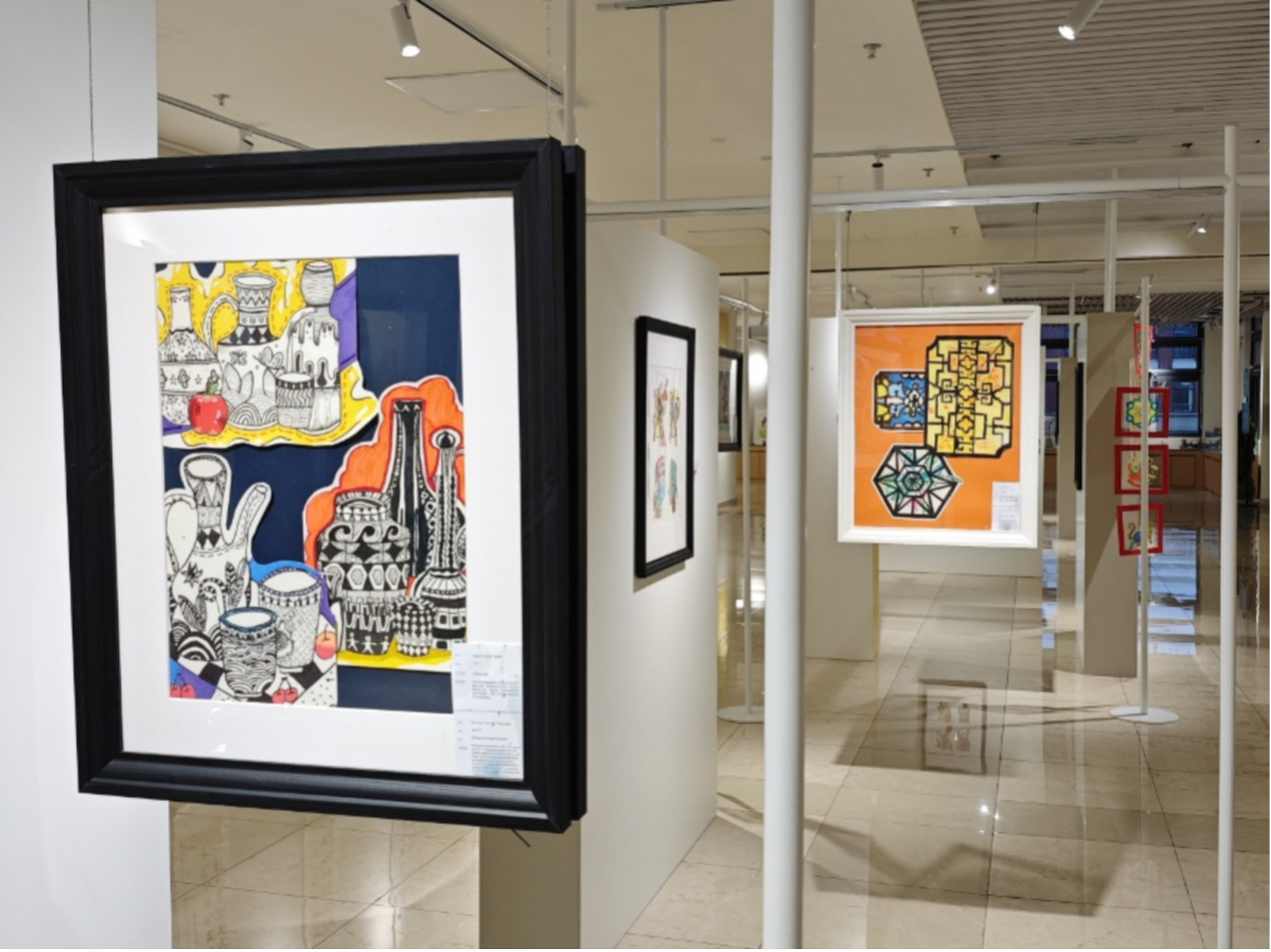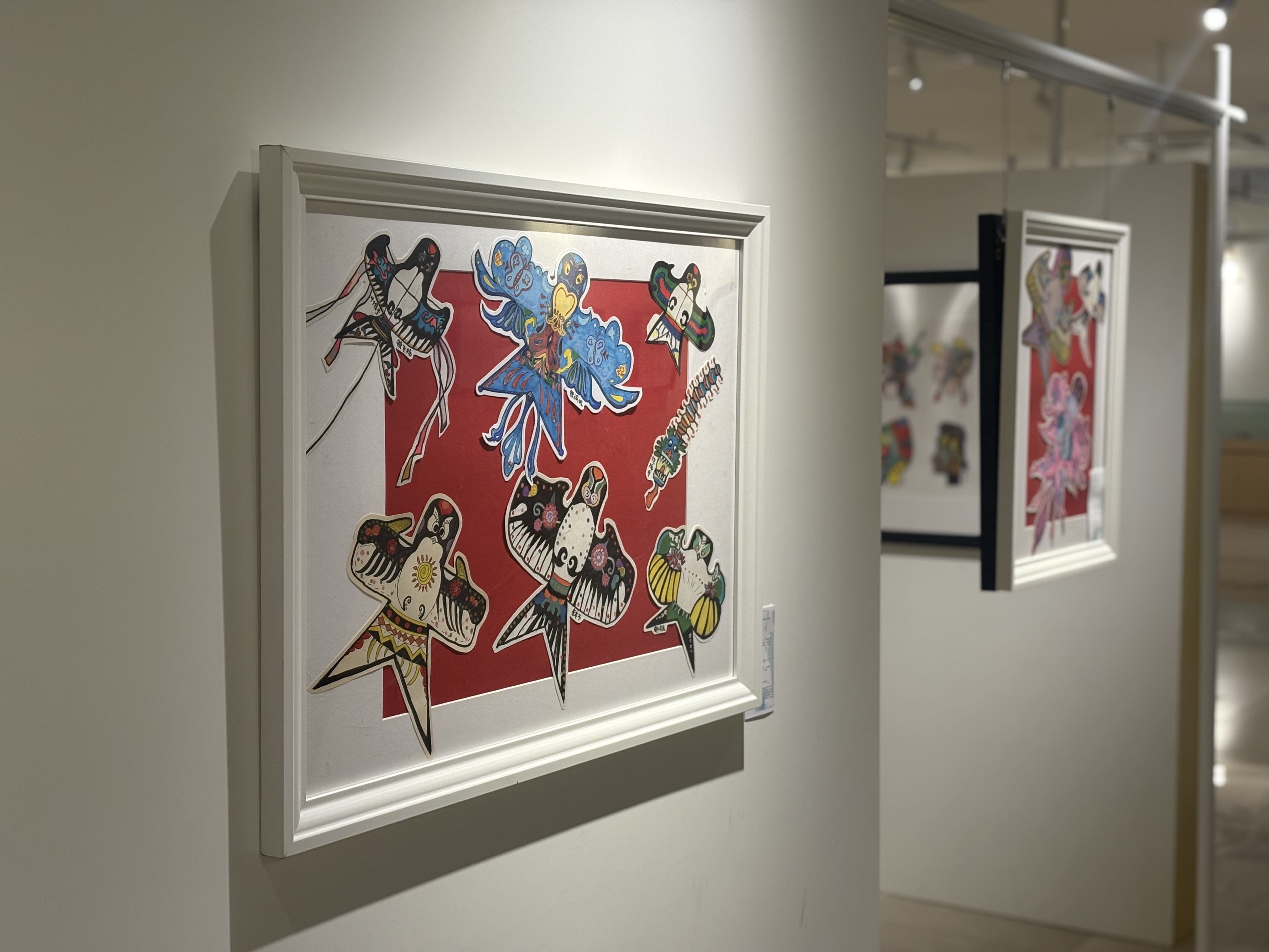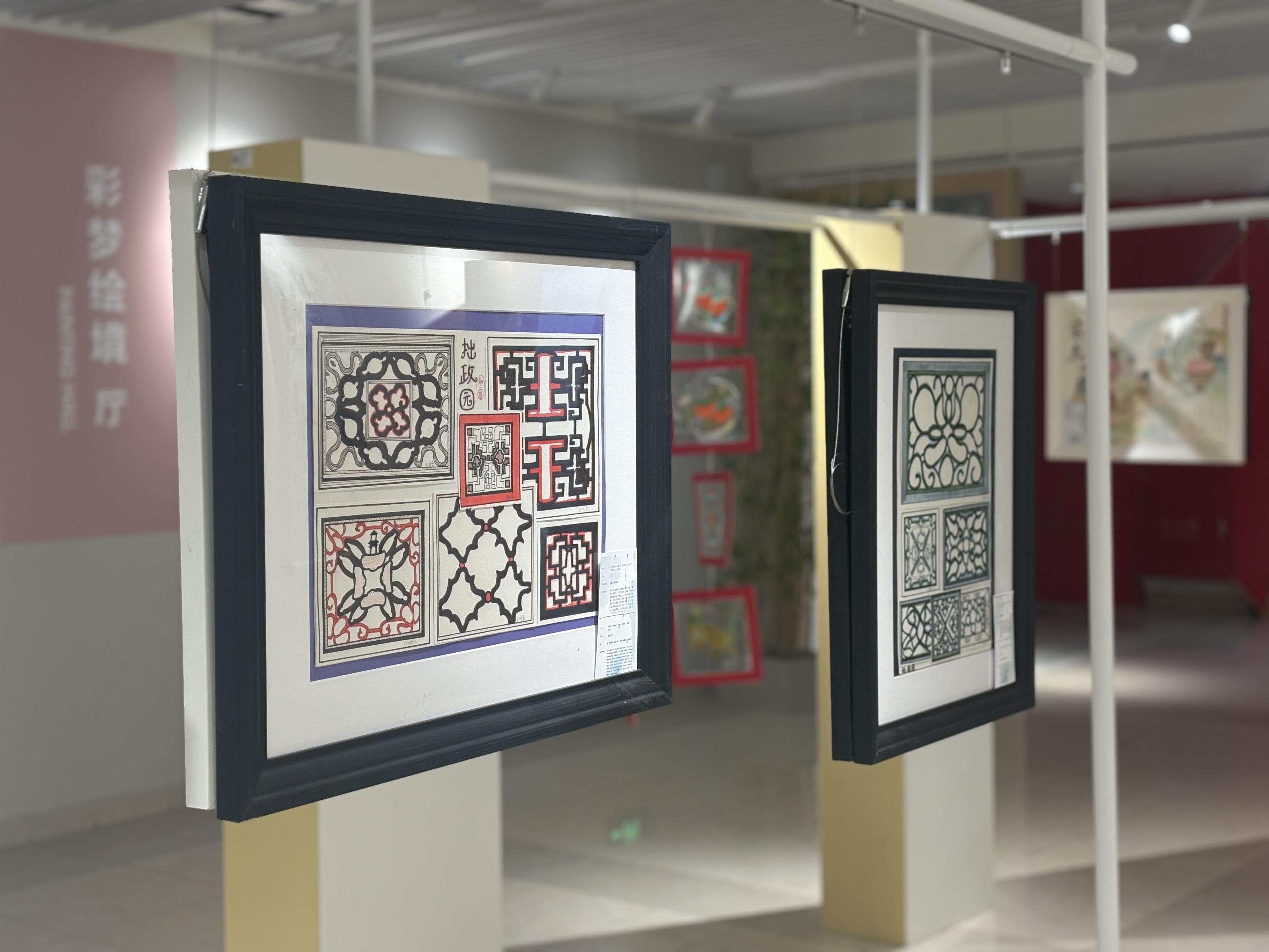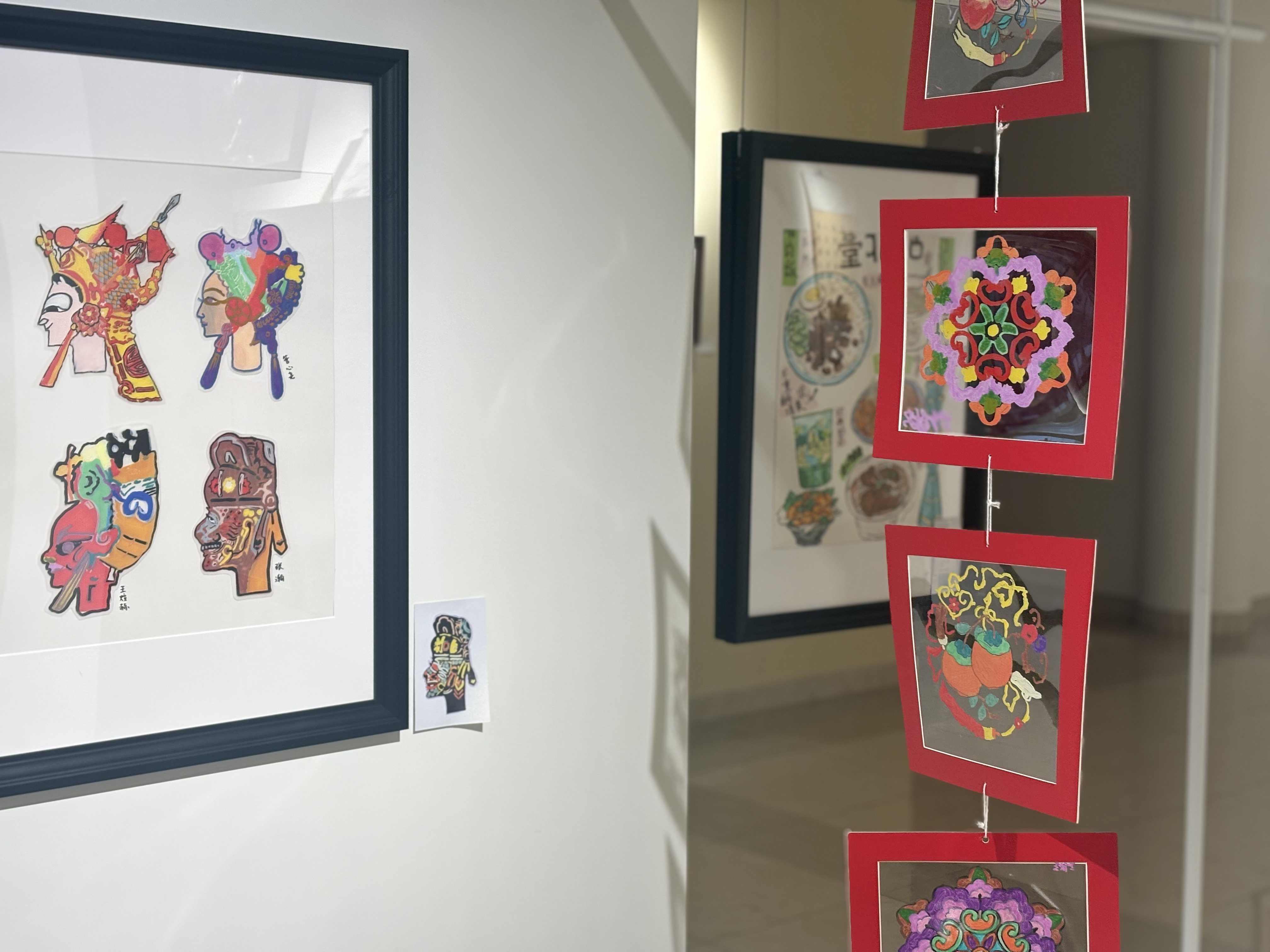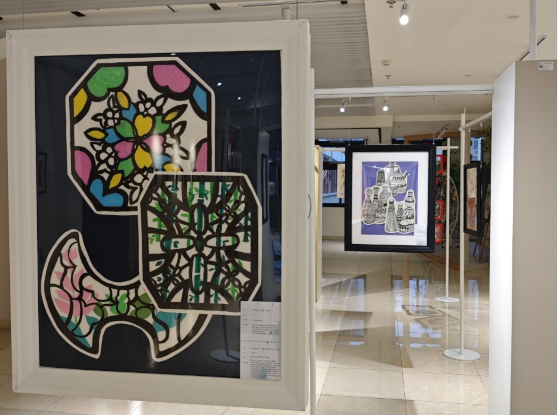 这是一场美术与英语融合的艺术对话。美术馆里,每一幅作品都是一个江南故事——上海金山农民画、江西景德镇青花、苏州园林漏窗剪影,以及山东潍坊风筝、浙江山水茶意、福建小吃风情,每件作品旁配有中英文双语展签。