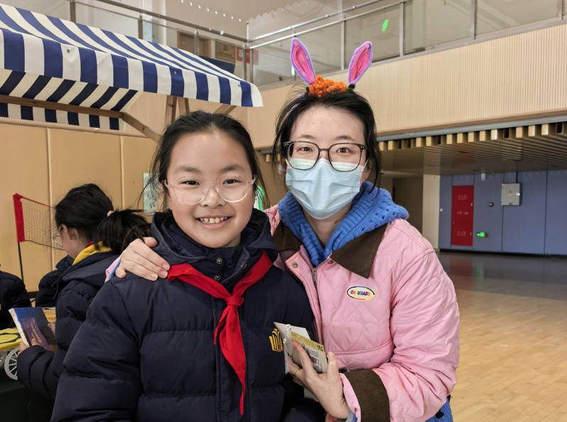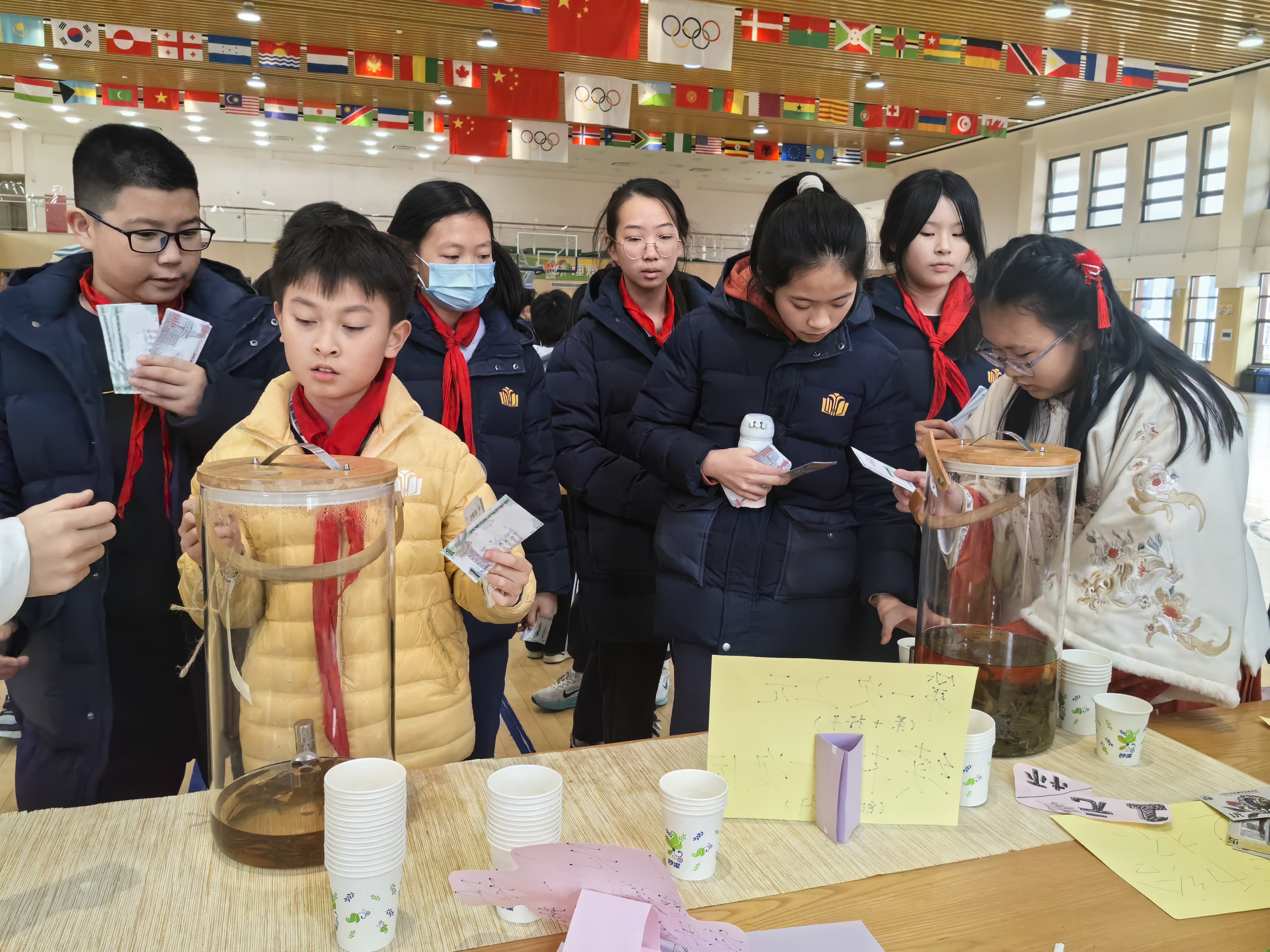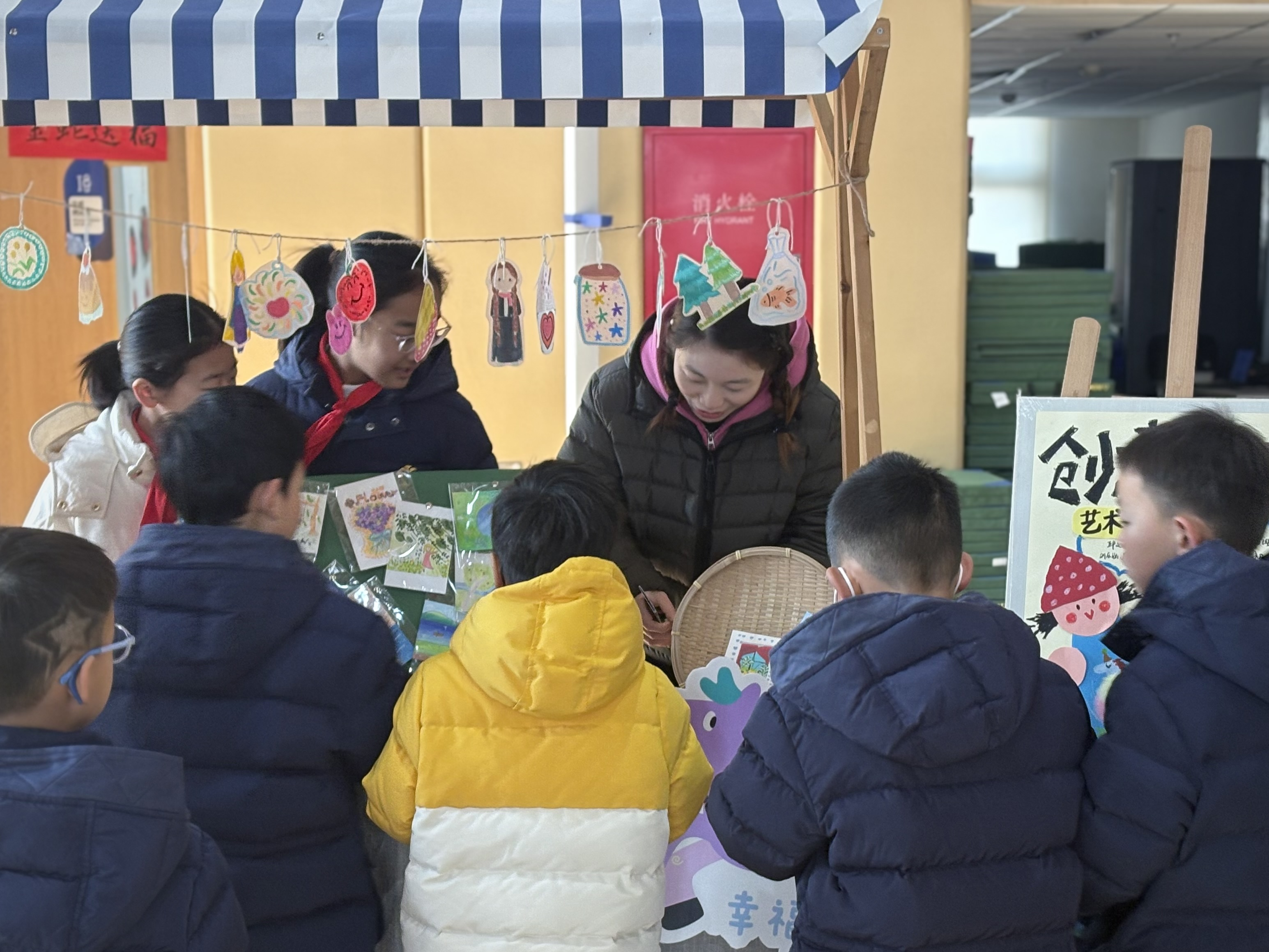 染织摊位彩绦轻垂,油画里光影流动,墨香在宣纸上静静舒展;中草药摊位茶烟温润,顺时而养摊位青翠如洗,草编玲珑,陶器朴拙——皆出自学生亲手创作。体验区更是趣味盎然:体育组的“九子游戏”转动旧日童趣,美术组的马年版画拓印时光与祥意。