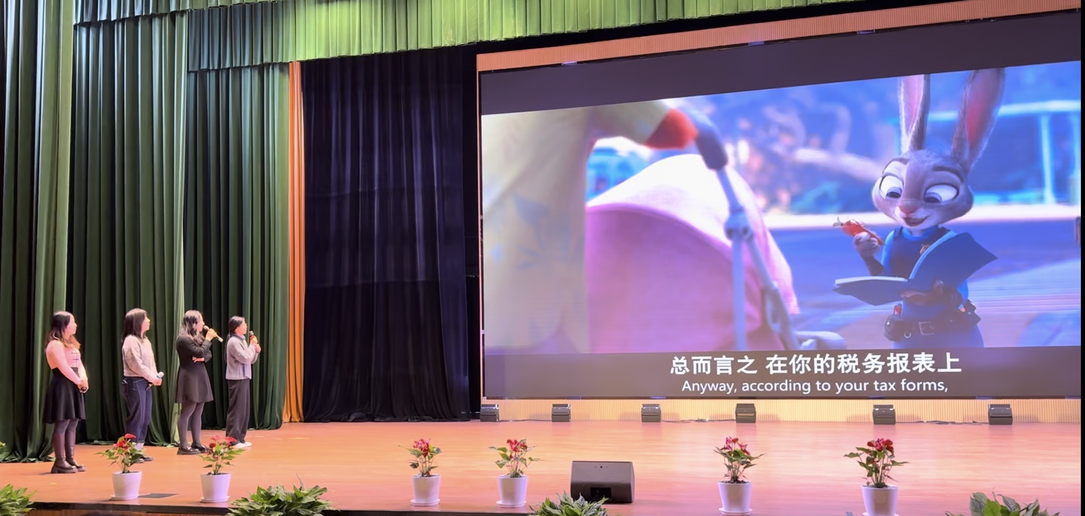 英语组的《Zootopia Vibe: Dub and Dance》堪称“活力天花板”!老师们化身疯狂动物城经典角色,专业流畅的配音搭配动感十足的舞蹈,将扎实的专业素养与灵动俏皮的舞台表现力完美融合,瞬间点燃现场氛围,赢得满堂喝彩。