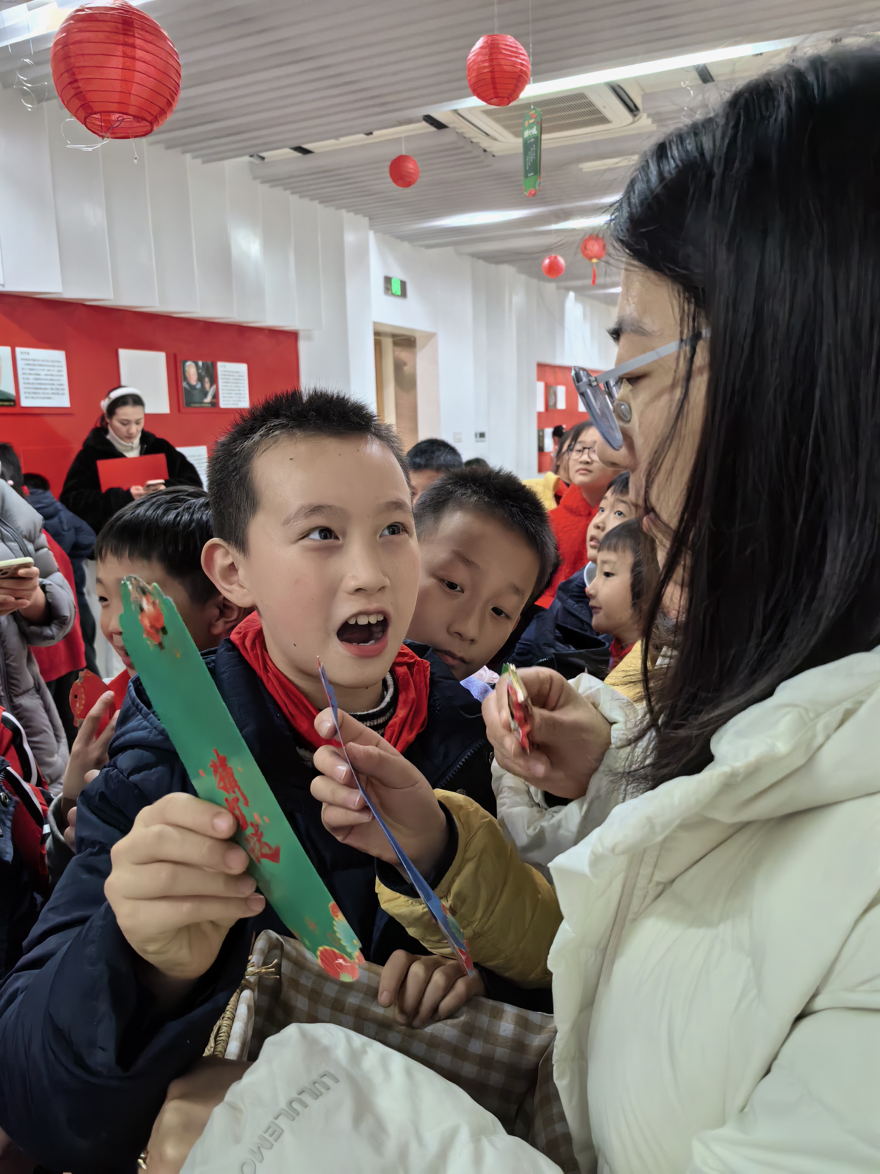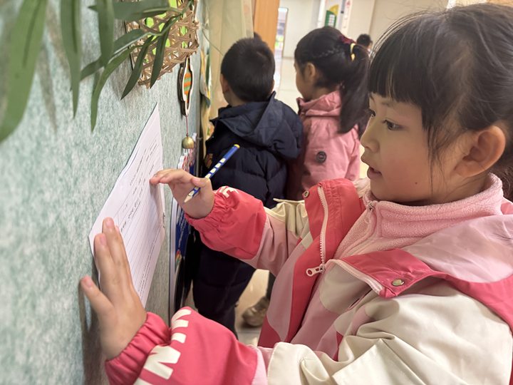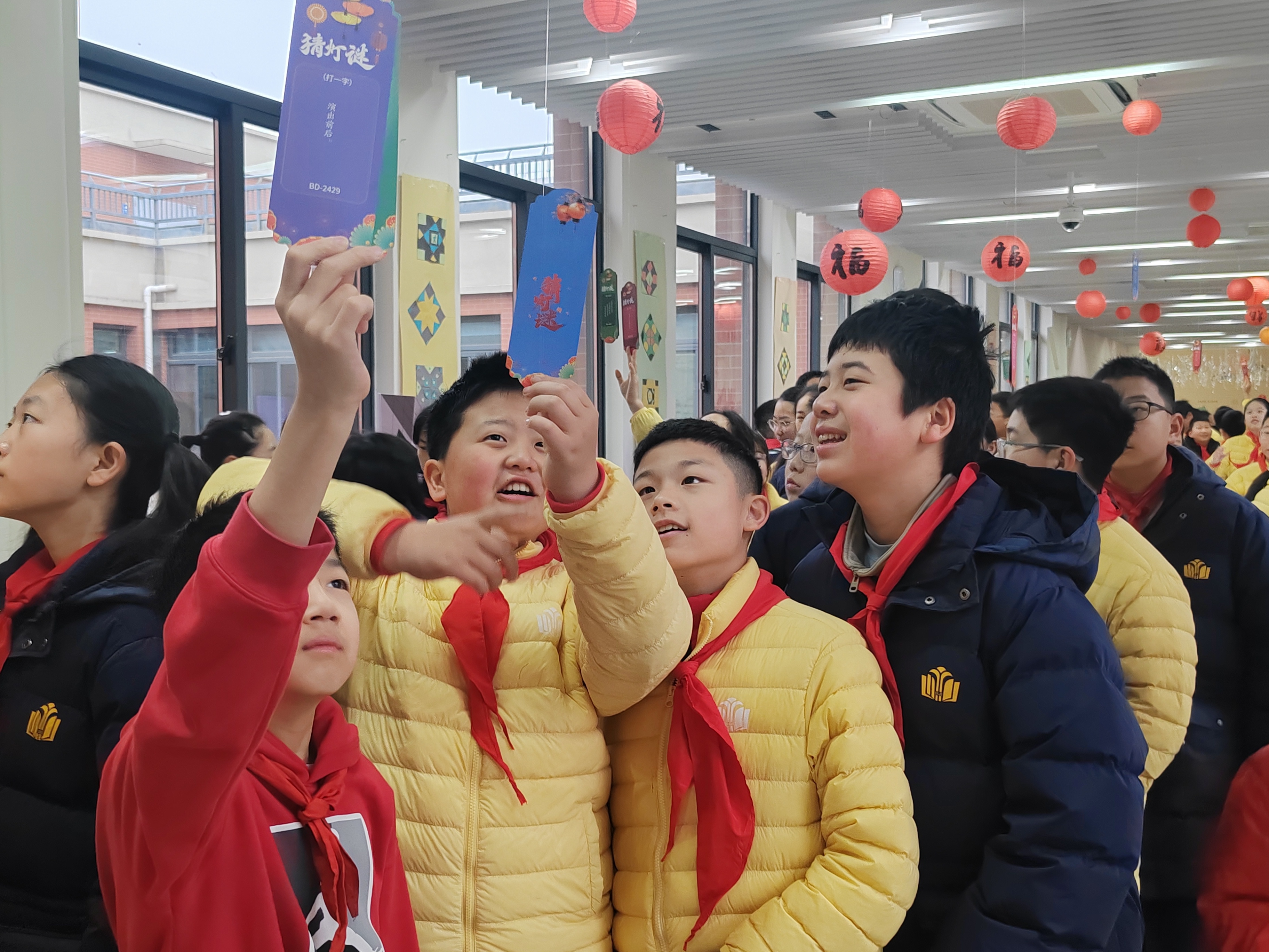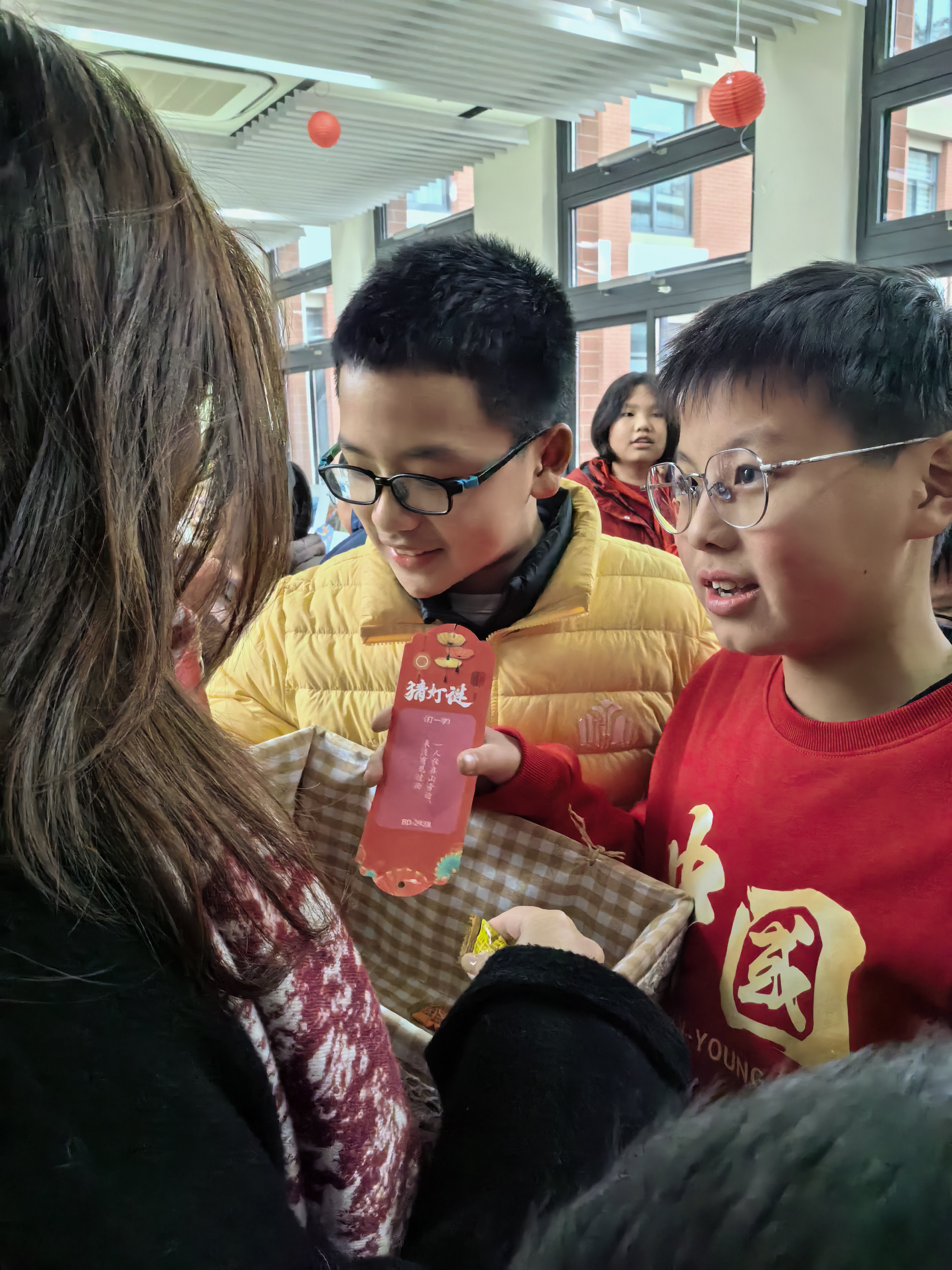 长廊里挂满了五彩缤纷的灯笼,每个灯笼下都垂着写满谜面的纸条。孩子们三五成群,或凝神思考,或热烈讨论,猜中谜底的瞬间欢呼雀跃,蹦蹦跳跳地去老师那里领取小奖品。“我知道!这个答案是‘月亮’!”一双双高举的小手,一张张兴奋的笑脸,让传统文化的种子在趣味中悄悄生根发芽。