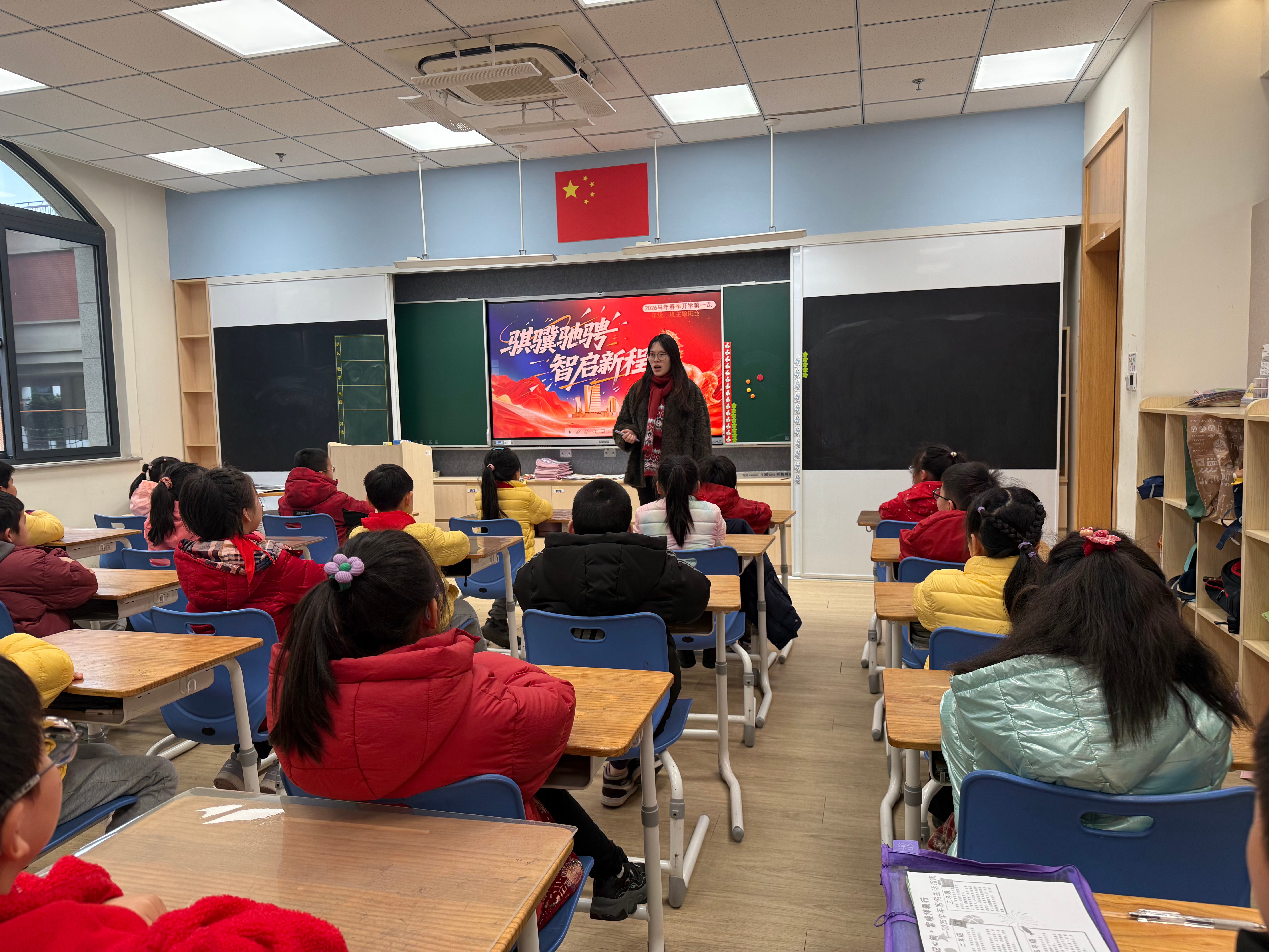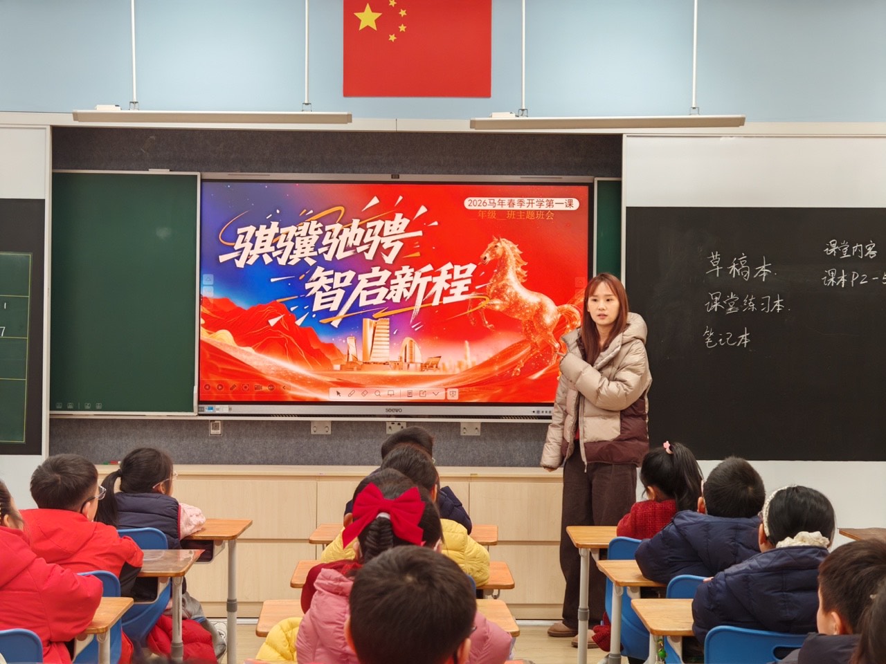 伴随着庄严的国歌声,全体师生肃立致敬,新学期开学典礼正式拉开帷幕。校长妈妈为孩子们送上新学期的殷切嘱托。她先用几个有趣的马年成语和孩子们欢乐互动,一句“马到成功”“策马扬鞭”,瞬间点燃了现场的气氛,也送上了对孩子们新学期最真挚的祝福。接着,她结合2035年十四亿中国人的强国梦,从“心怀梦想”谈到“脚踏实地”,并鼓励孩子们将个人成长与国家发展紧密相连,最终再落到与爱同行的三大期许上,一字一句都饱含着对孩子们成长的深切关怀。