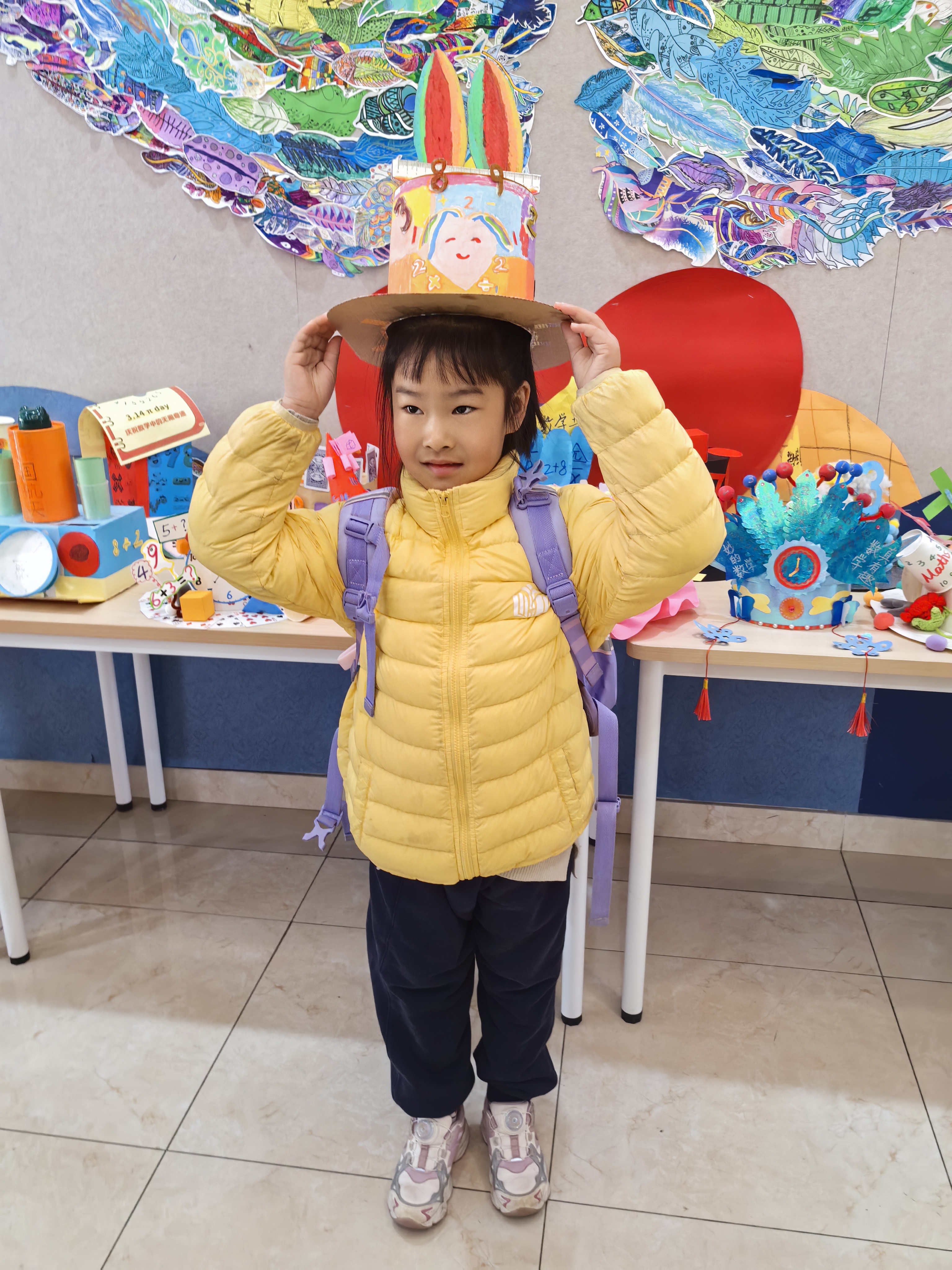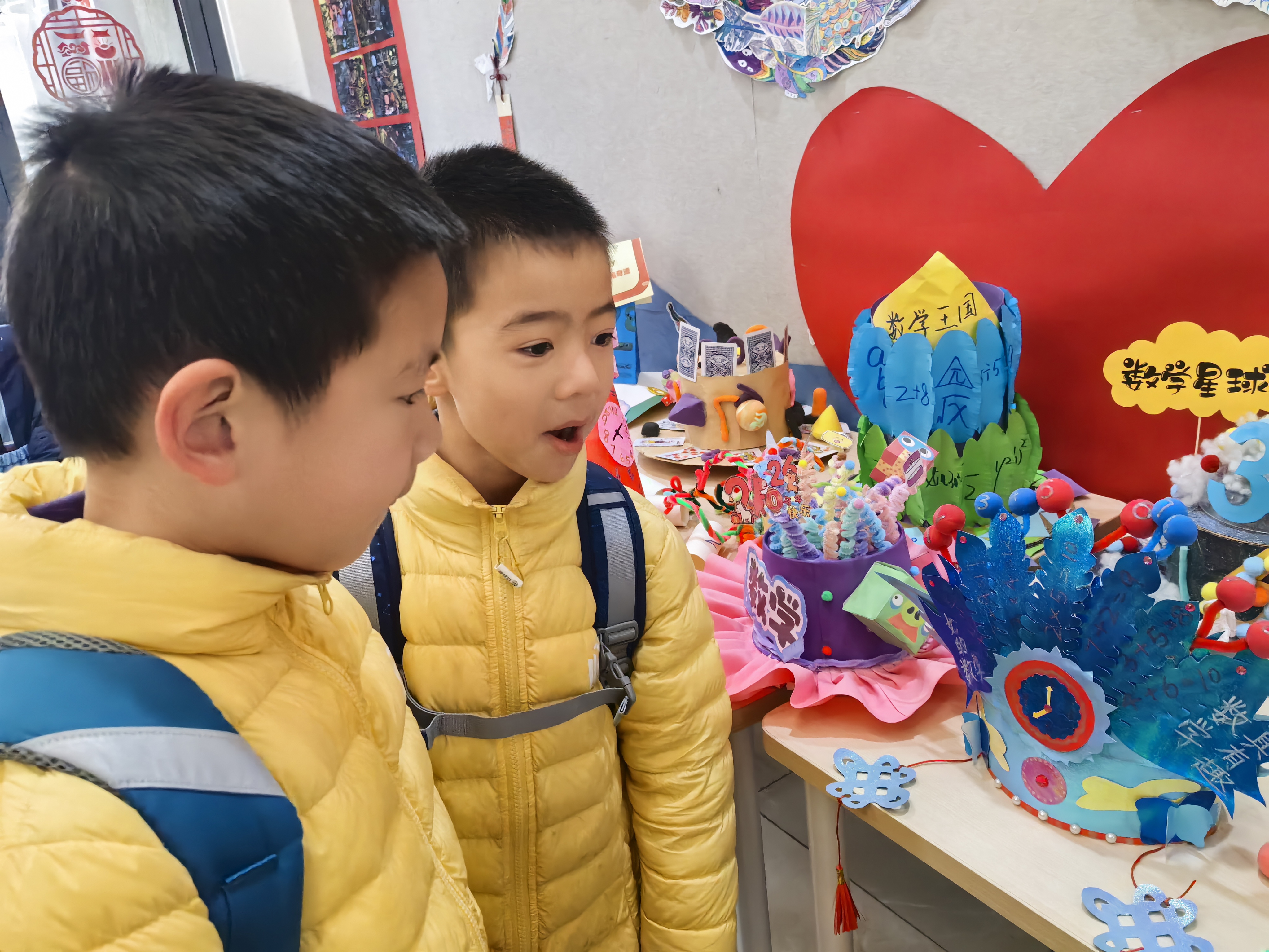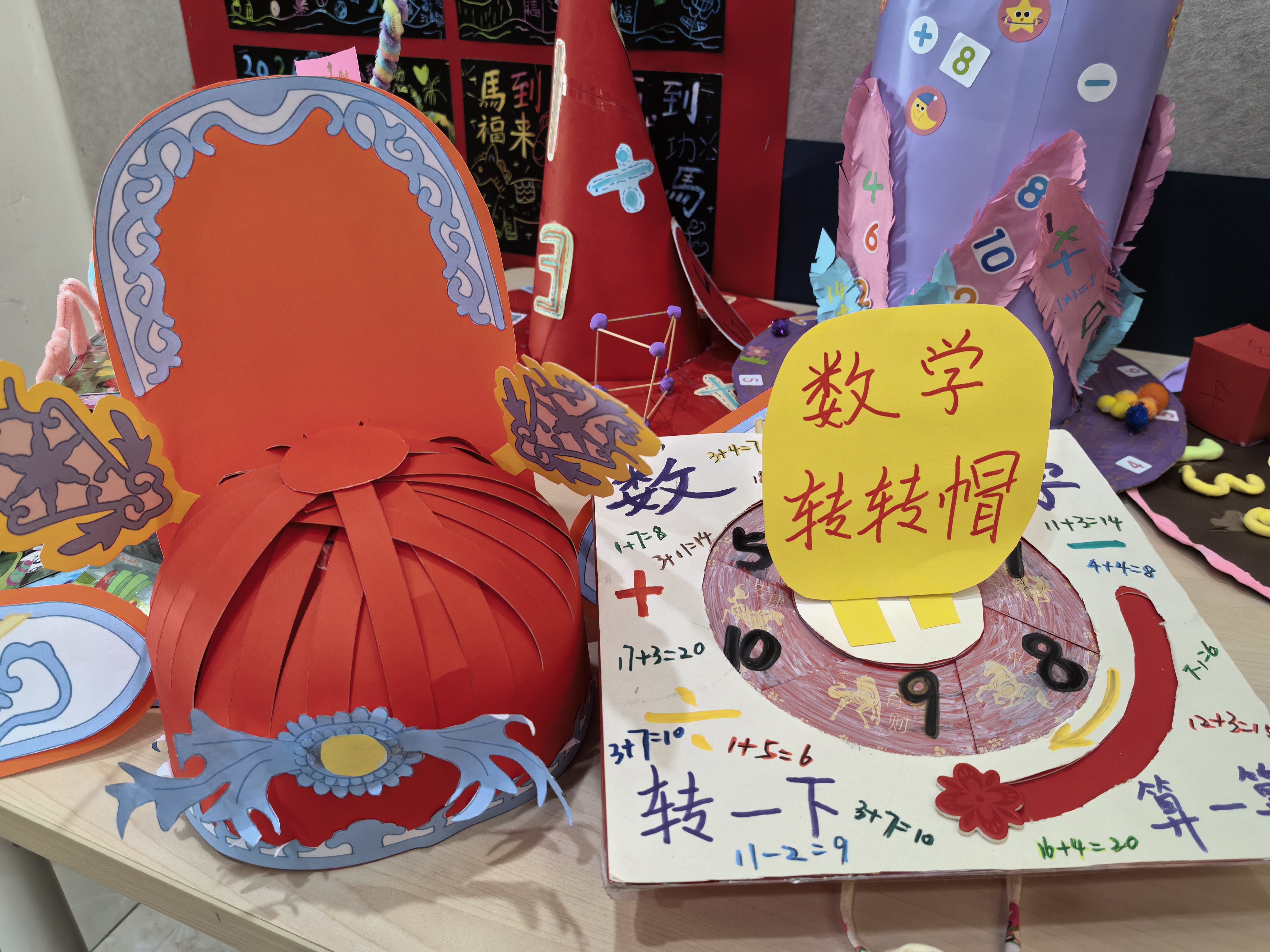 当创意遇上数学,平凡的材料也能绽放别样光彩。一年级数学“帽”险记欢乐开启,孩子们在温馨的亲子时光里,与家人一同奇思妙想、动手创作,将卡纸、黏土、废旧材料巧加改造,时钟、立体几何图形、加减乘除符号、乘法口诀跃然帽檐。每一顶手工帽都是独一无二的数学作品,孩子们化身“小小数学家”,戴着创意帽子分享背后的数学故事,让数字变得看得见、摸得着,在动手实践中悄然种下热爱数学的种子。