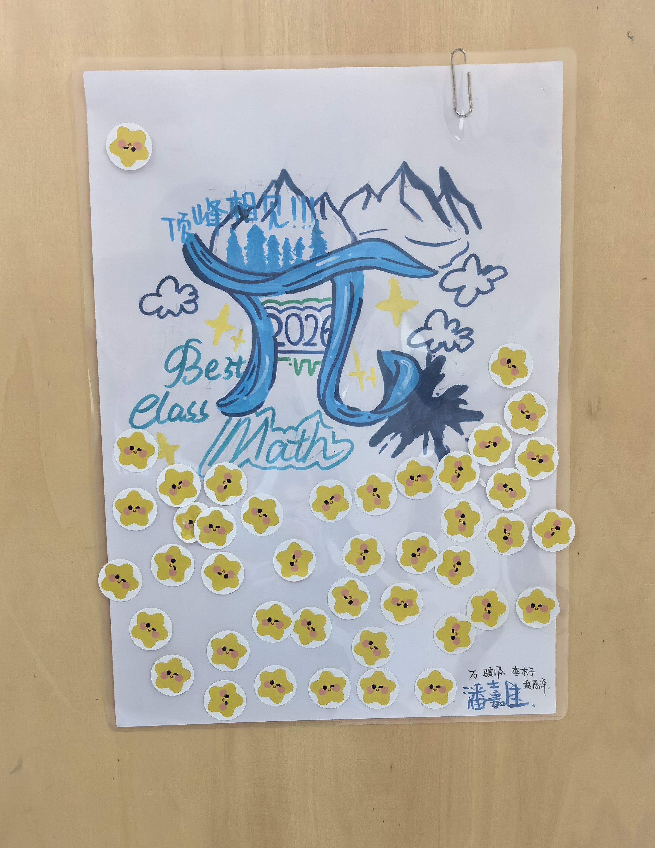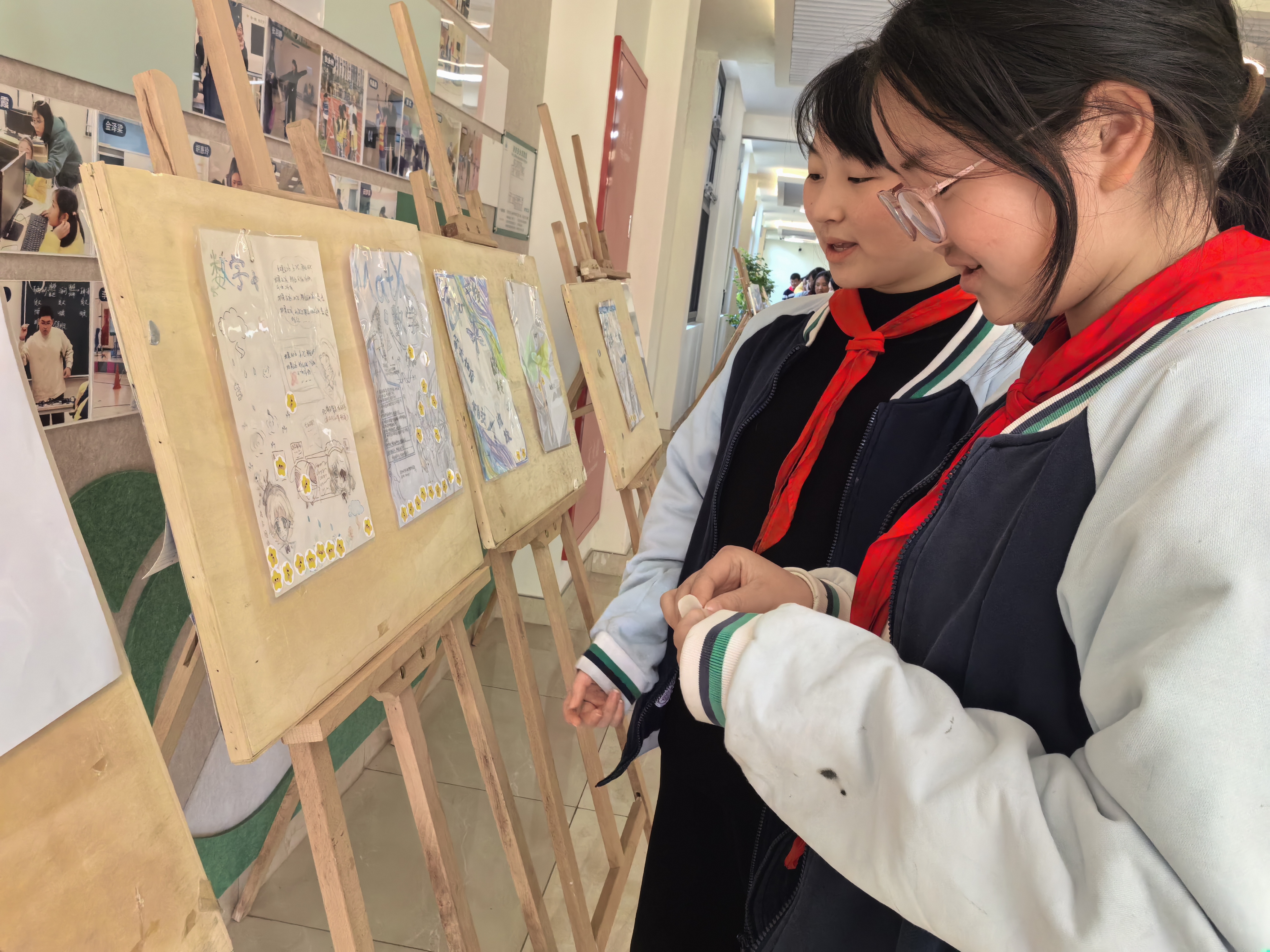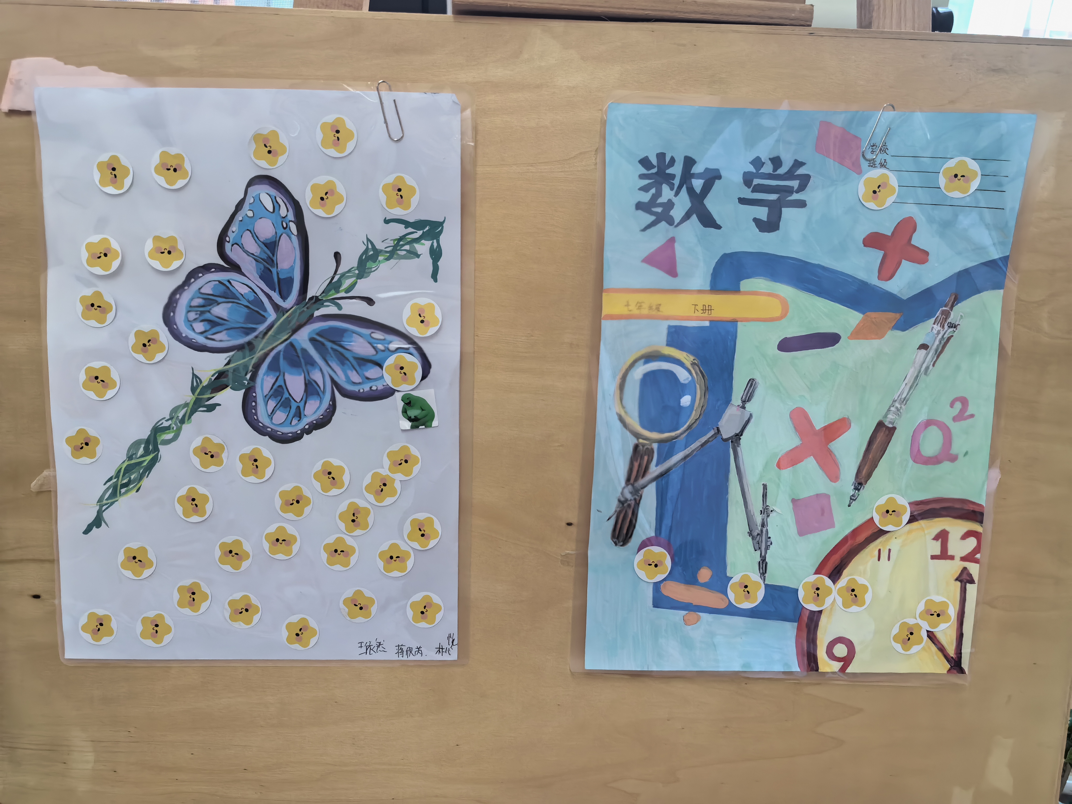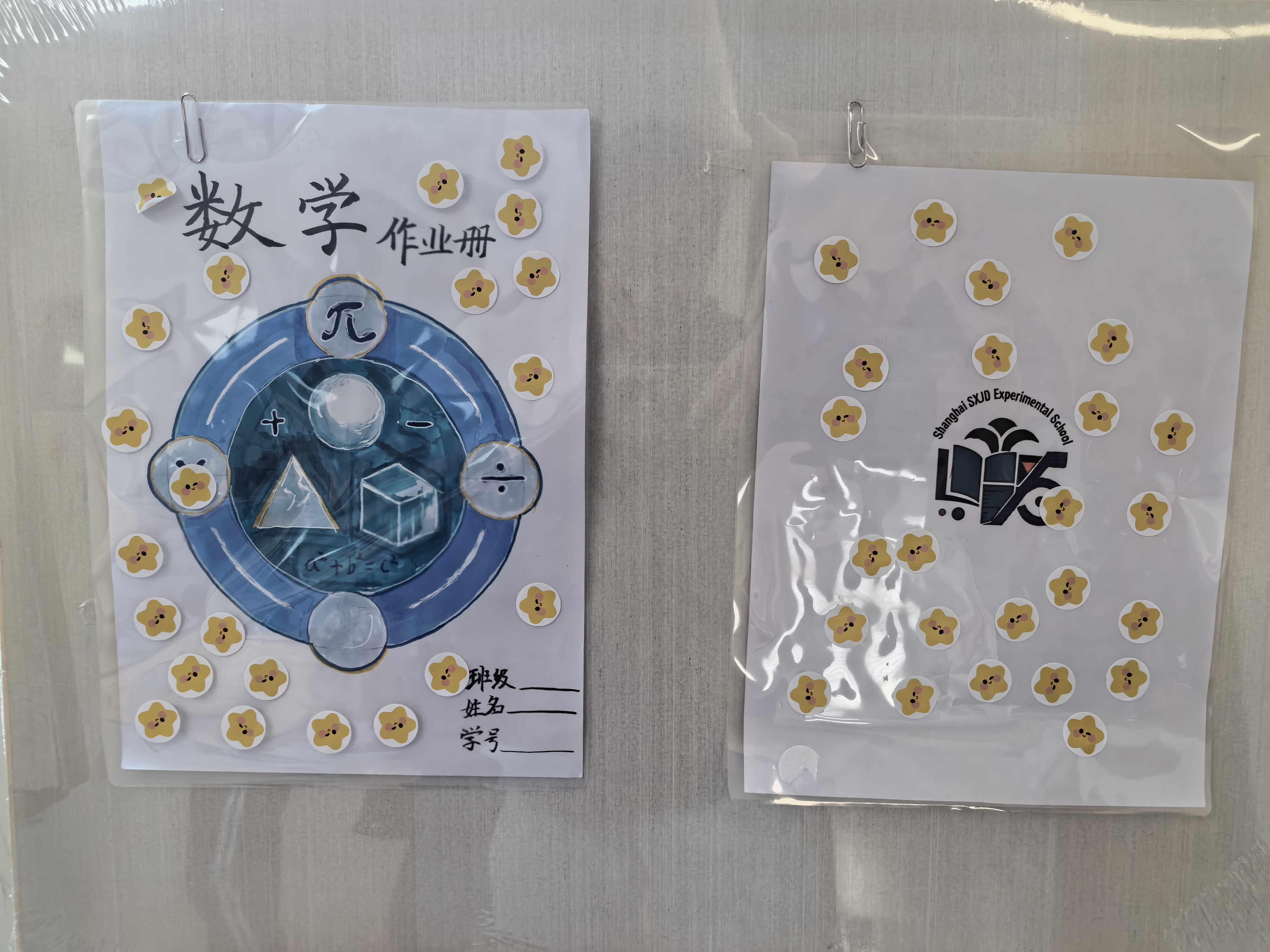七年级则以“图形的运动”为灵感,开启“数”说设计之旅。各班小组分工协作、热烈研讨,将平移的秩序、旋转的韵律、对称的美感融入校本作业封面设计,用彩笔勾勒线条,用色块描绘创意,让数学知识拥有了灵动的视觉表达。设计作品在教学楼走廊精彩展出,课间的走廊化身“迷你数学画廊”,同学们驻足观赏、投票点赞、交流巧思,让静止的知识点,成为触手可及的创意风景。