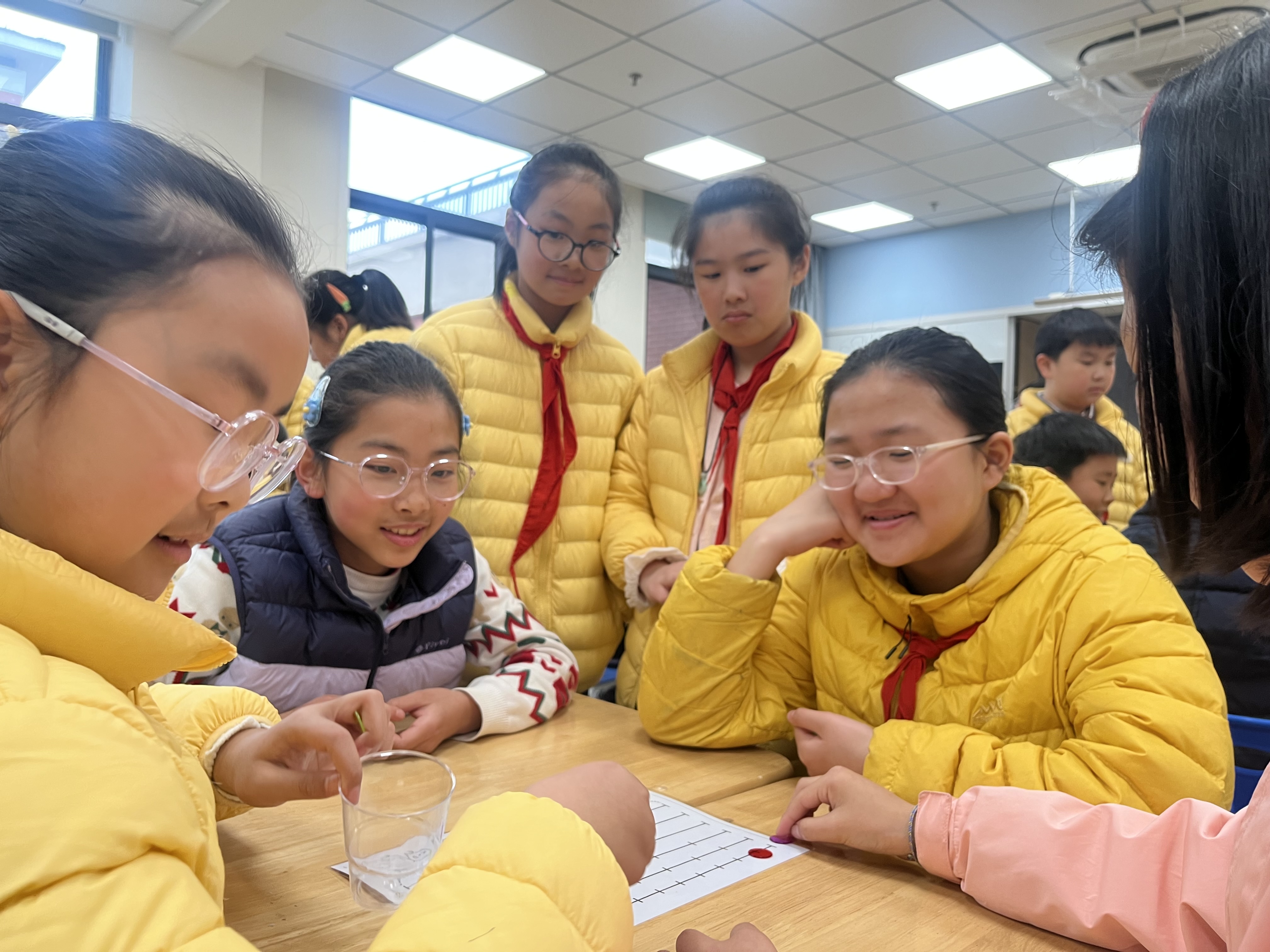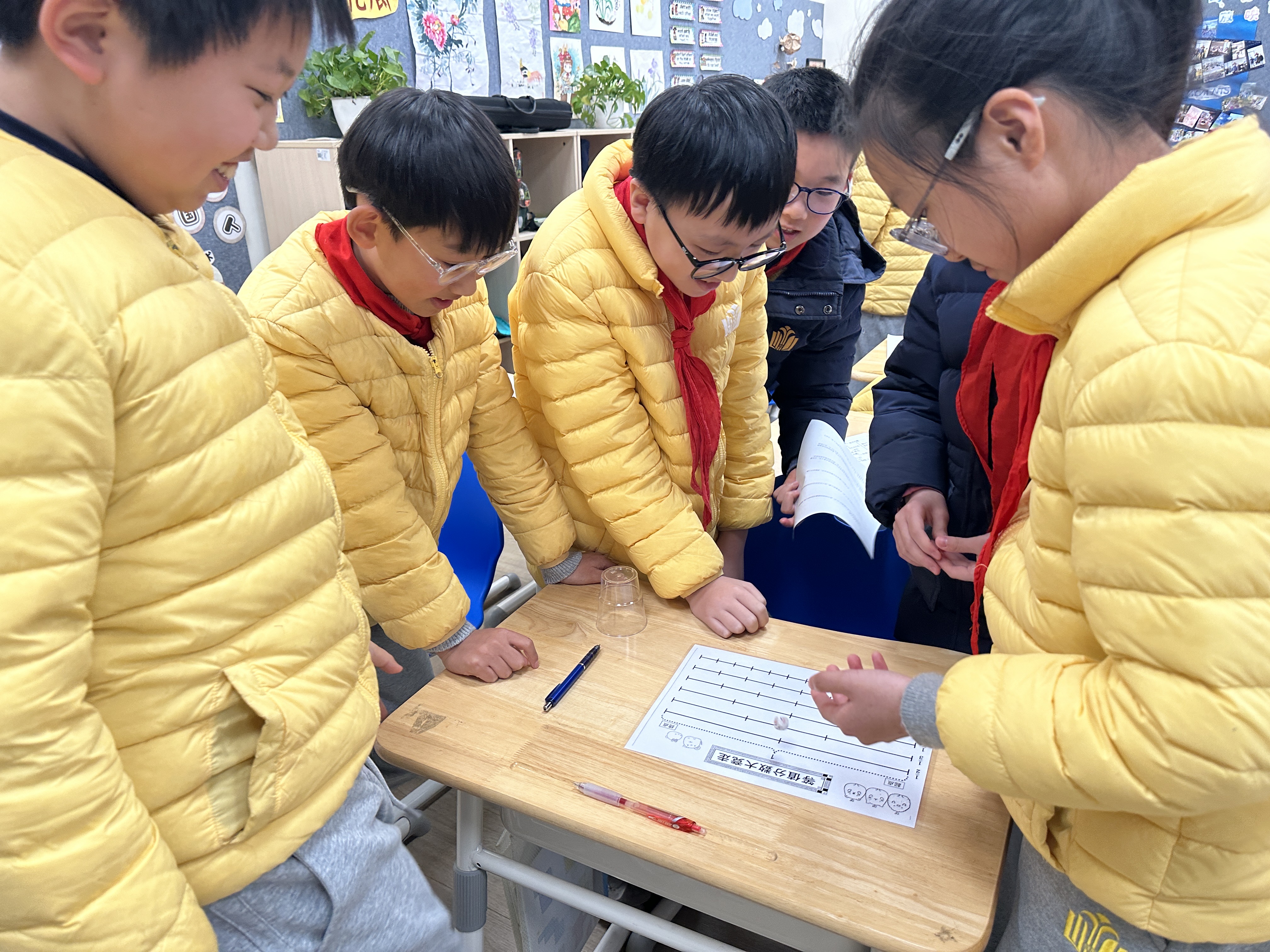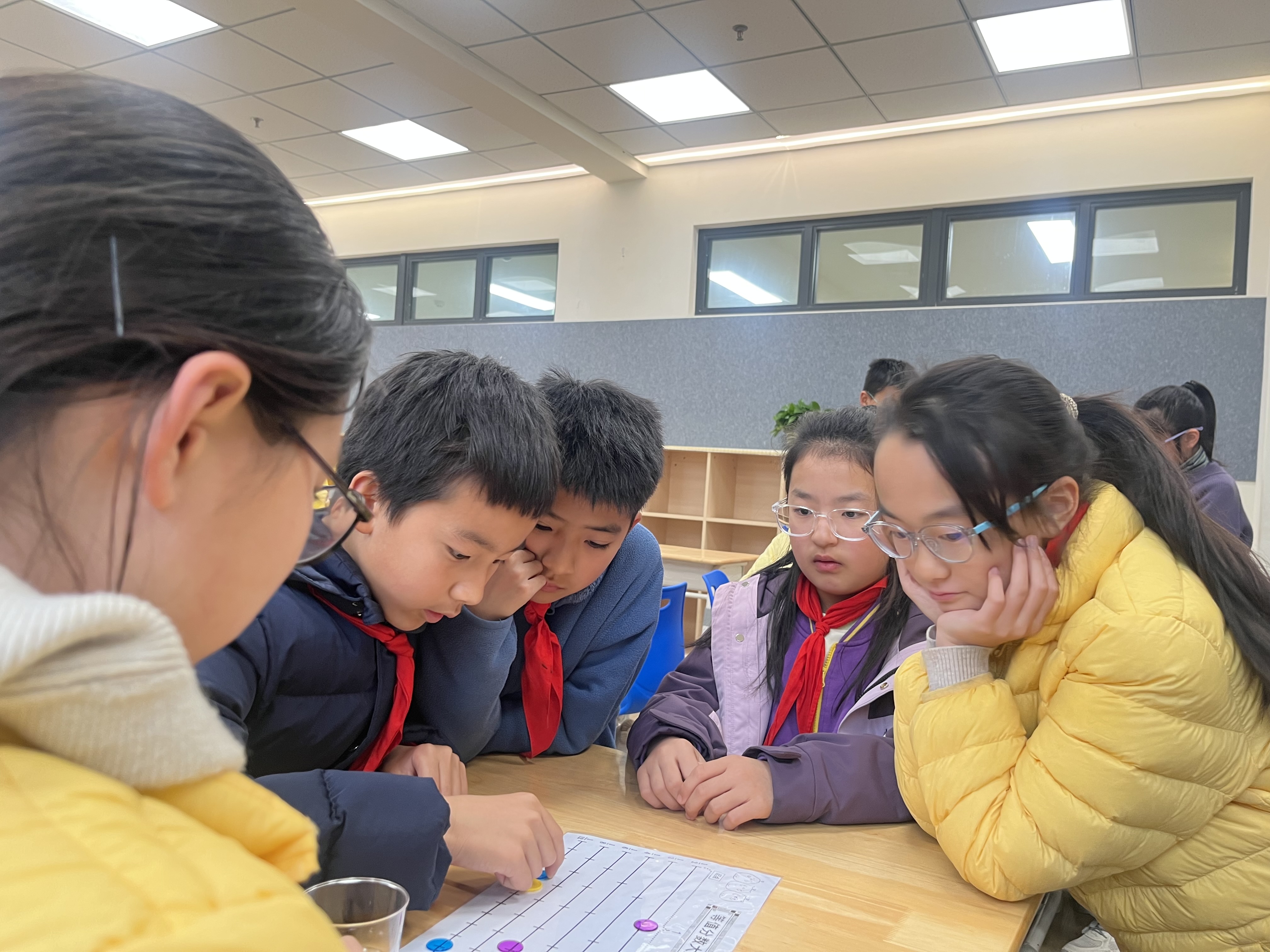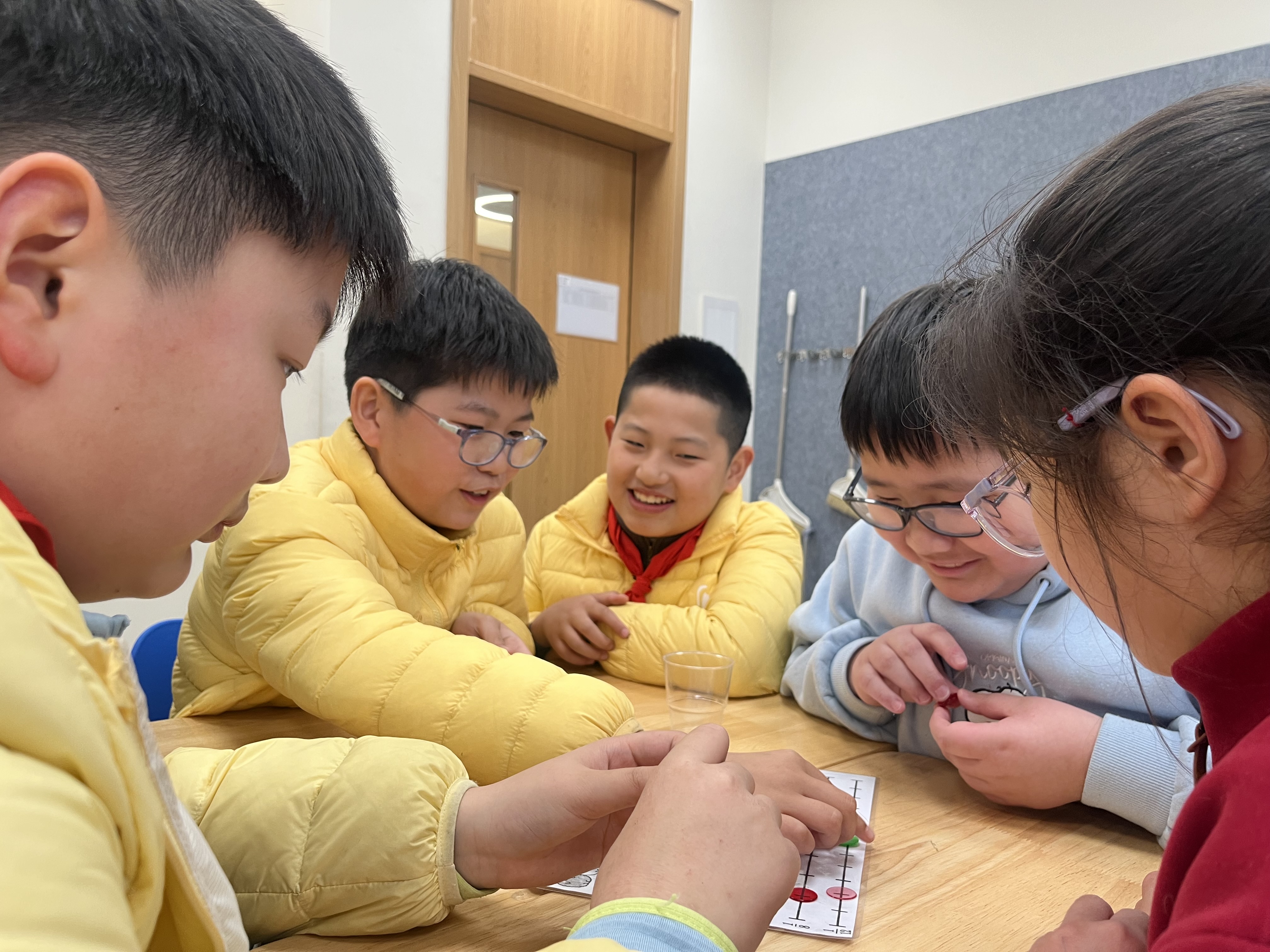 五年级等值分数大竞走趣味闯关,让抽象的分数知识变得鲜活生动。四人小组并肩作战,手持圆片,跟着骰子点数寻找等值分数大步“竞走”,横向行进、不可跨行的规则,考验着大家的细心与规则意识。当圆片争先抵达终点,欢呼声便响彻赛场,孩子们在小组协作中快速迸发思维,在玩中学、学中乐,让枯燥的知识点,成为趣味满满的闯关体验。